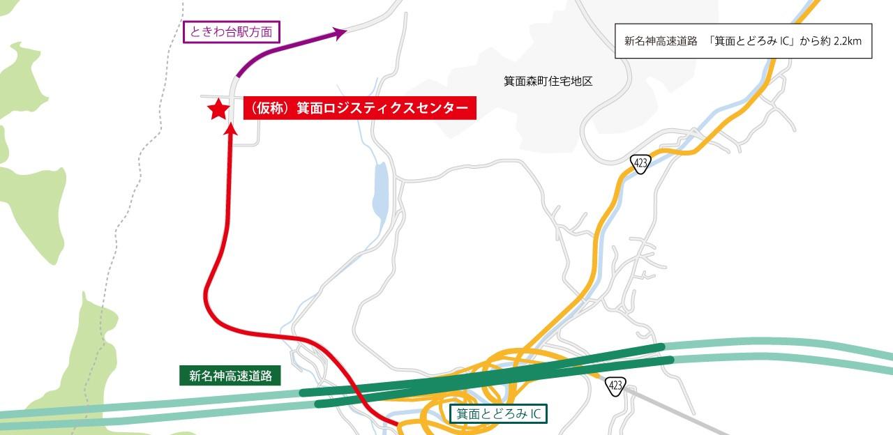本物件は、大阪市中心部から25km圏内に位置し、新名神高速道路「箕面とどろみ」インターチェンジから約2.2㎞、阪神高速道路「池田木部」インターチェンジから約7.2km、中国自動車道「中国池田」インターチェンジから約13.5kmと、物流拠点としてのアクセスに優れています。新名神高速道路は、2023年度に「高槻」から「八幡京田辺」ジャンクション・インターチェンジ間の開通が予定されており、阪神間および名神、西日本広域への配送拠点として、交通利便性の飛躍的な向上が見込まれます。近接する大阪府の箕面森町住宅地区は、宅地の分譲、小・中一貫校の設置などにより人口が増加しているエリアであり、雇用確保の点でも有利な環境を有しています。